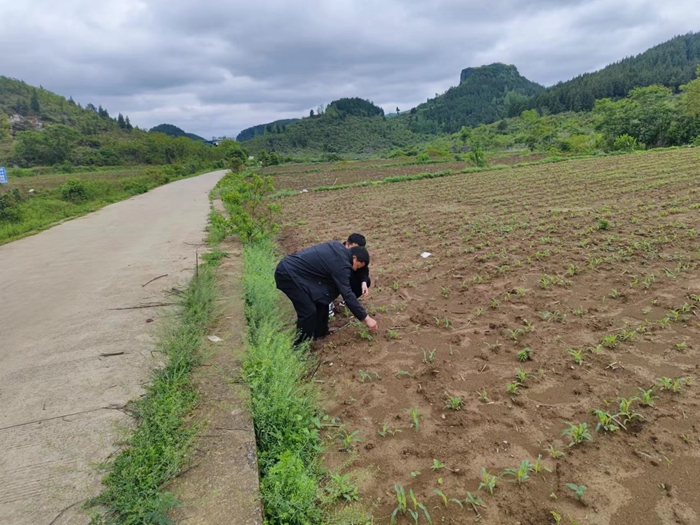 4月24日,万胜种业公司副总经理崔跃、技术辅导员李应军到张家寨镇玉米制种基地查看玉米出苗情况。